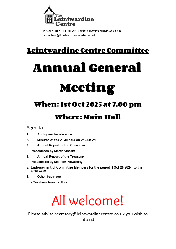 This year’s AGM will take place on Wednesday 1st October at 7.00pm in the Main Hall of the Centre. Everyone is welcome. Please get in touch with Kim Smith, the Centre Secretary, if you wish to attend.